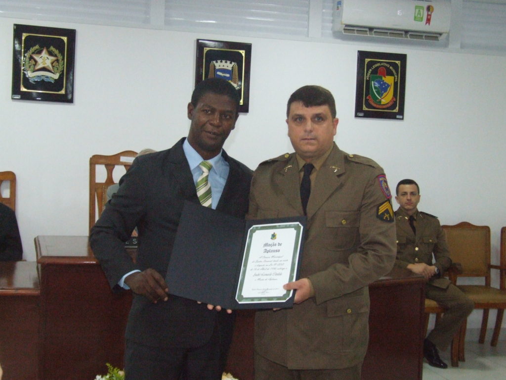 Em seguida, em nome dos homenageados com o Título de Moção de Aplausos, o Delegado de Polícia, Dr. Carlos Capristrano, representando o 13º Departamento de Polícia Civil de Barbacena, fez um discurso de agradecimento onde enalteceu o carinho e a dedicação com que a Polícia Civil do Estado de Minas Gerais vem realizando o seu trabalho em Santos Dumont.